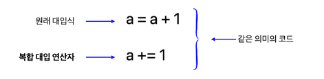 - 복합 대입 연산자는 연산과 할당을 합쳐 놓은 것 Assignment Operator is a combination of operations and assignments