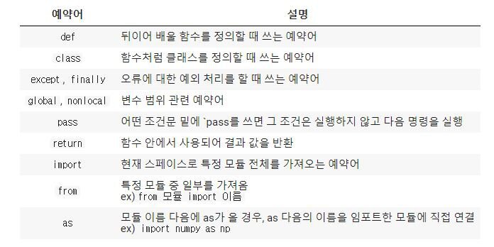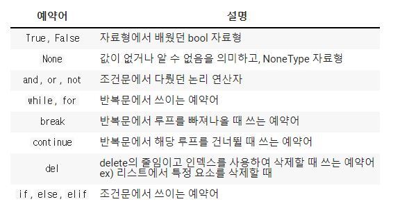 - 예약어 중 True, False, None 을 제외하고는 모두 소문자로 이루어져 있음 (예약어는 대,소문자를 구별하니 주의)